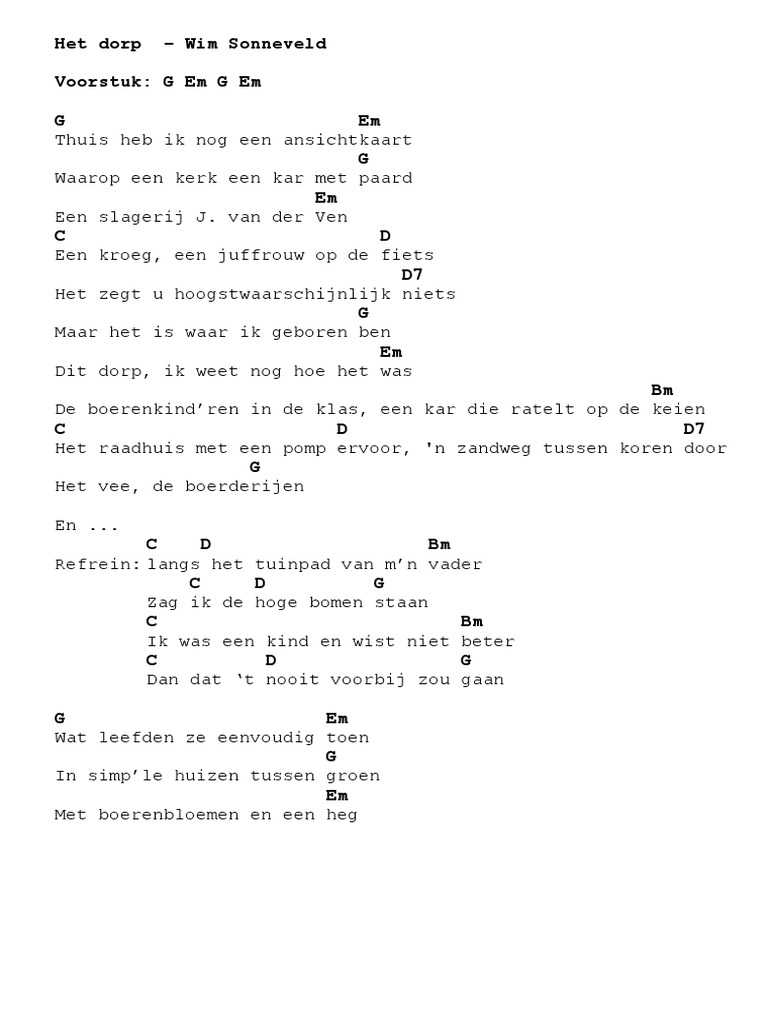 Het Dorp - Wim Sonneveld. Thuis heb ik nog een ansichtkaart waarop een kerk een kar met paard, een slagerij J. van der Ven Een kroeg, een juffrouw op de fiets Het zegt u hoogstwaarschijnlijk niets, maar het is waar ik geboren ben Dit dorp Ik weet nog hoe het was De boerenkind'ren in de klas Een kar die ratelt op de keien Het raadhuis met een.